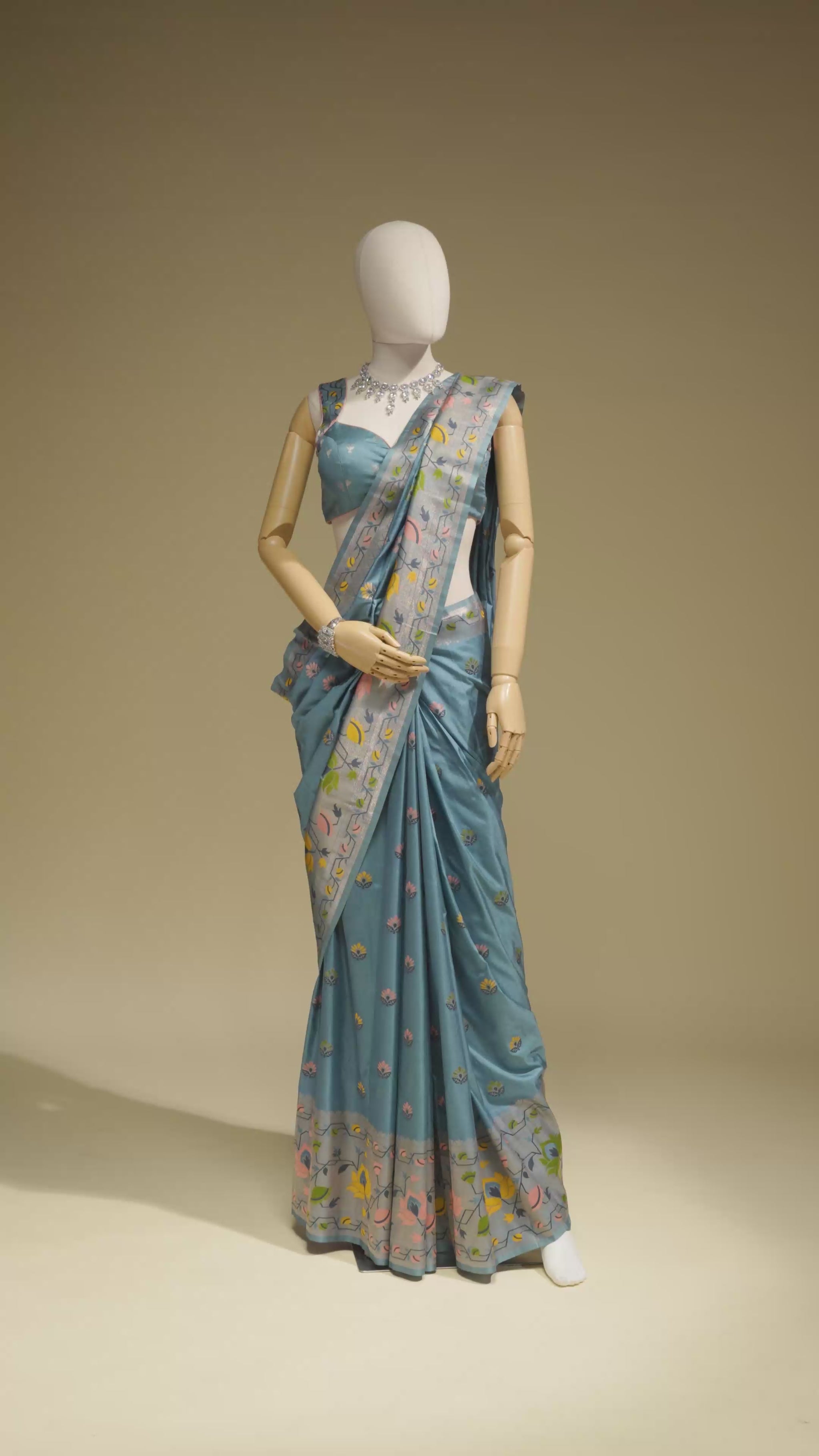 Dry Clean Only to preserve the delicate Paithani weave, the luxurious Dola silk fabric, and the beautiful dusty blue tones of the saree.