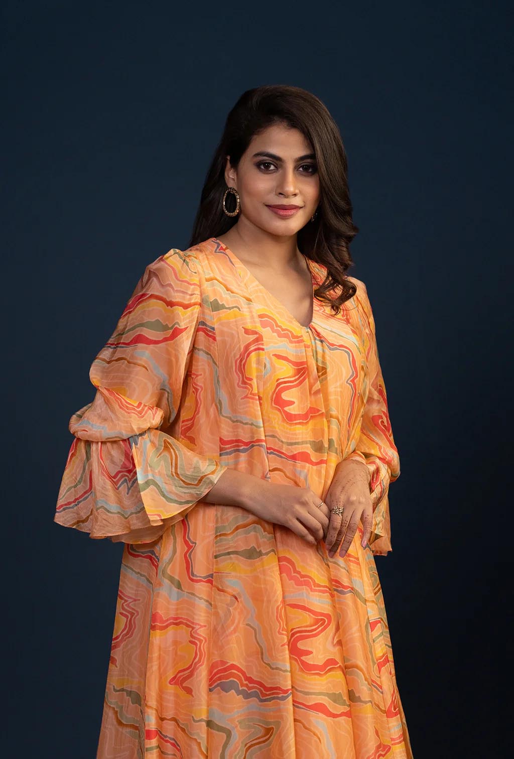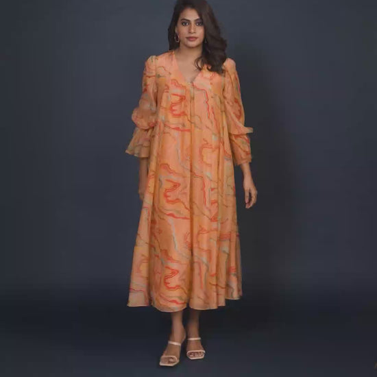 Step into contemporary elegance with our Peach Abstract Print Midi Dress. This captivating dress combines a soft, inviting hue with a modern artistic print, creating a truly unique and sophisticated look.