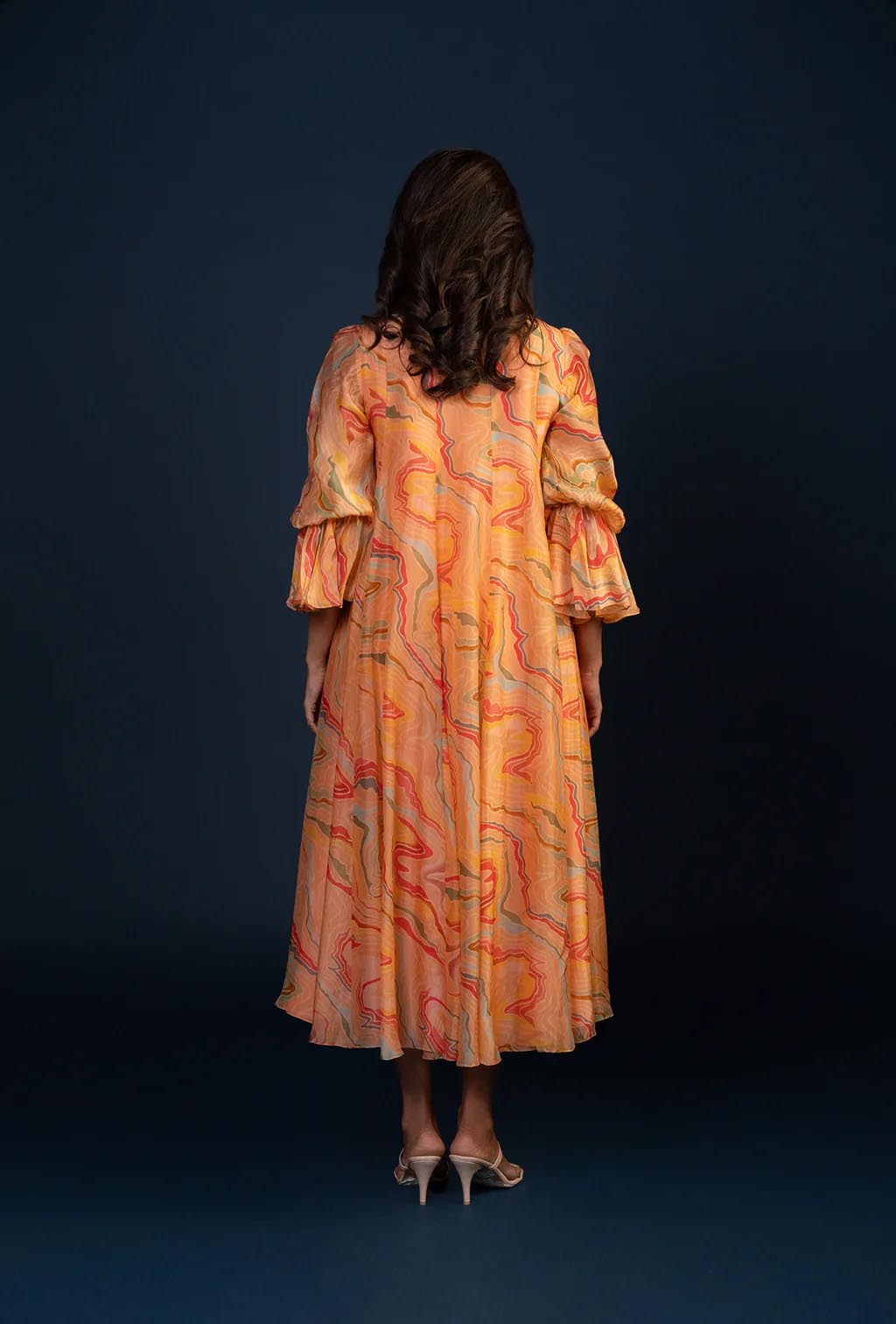 Order now and infuse your wardrobe with the artistic charm of the Peach Abstract Print Midi Dress.