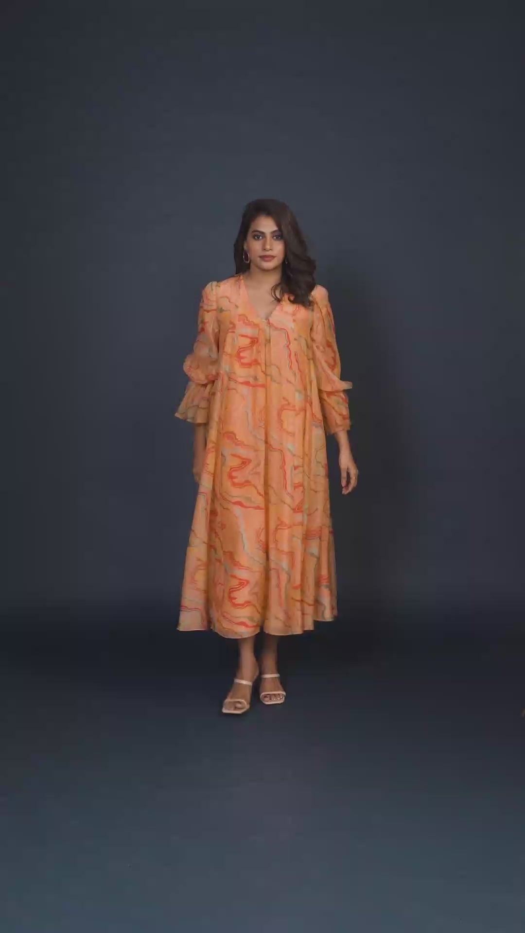 Crafted in a delicate peach color, this midi dress is beautifully adorned with an intriguing abstract print. The unique patterns and fluid lines add a touch of modern artistry and visual interest, making this dress a standout piece. The midi length offers a versatile and universally flattering silhouette, perfect for a range of occasions.