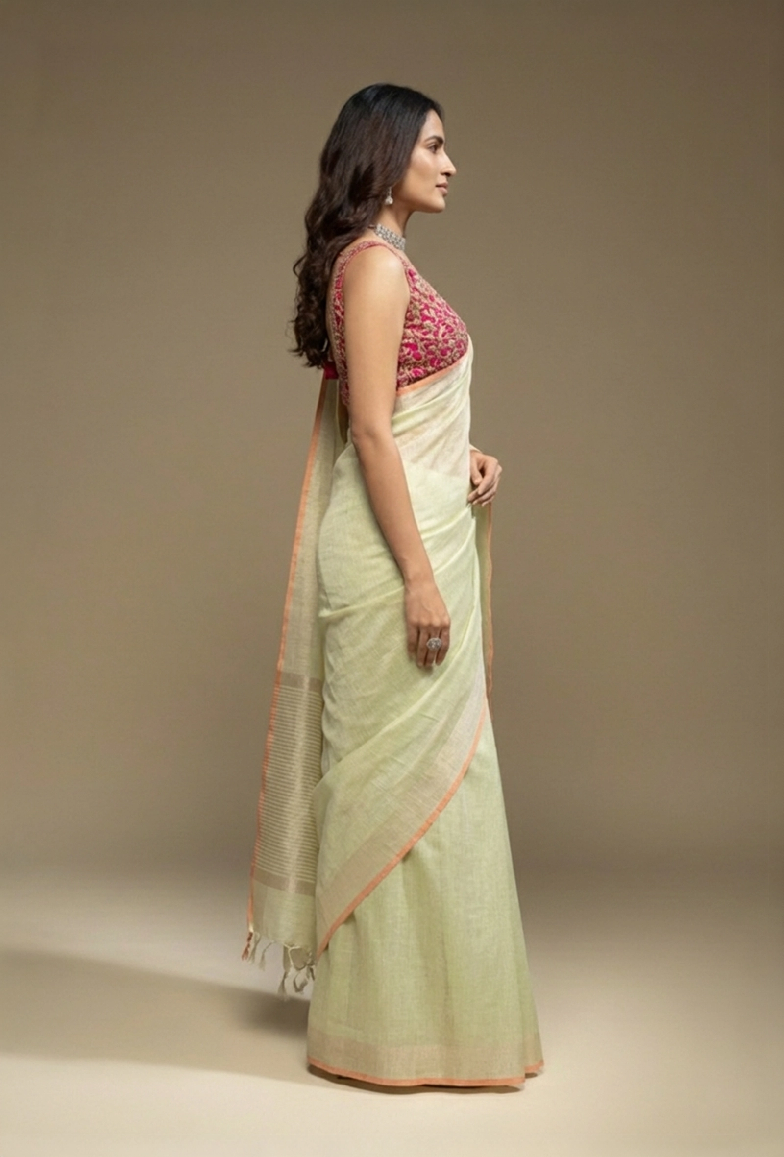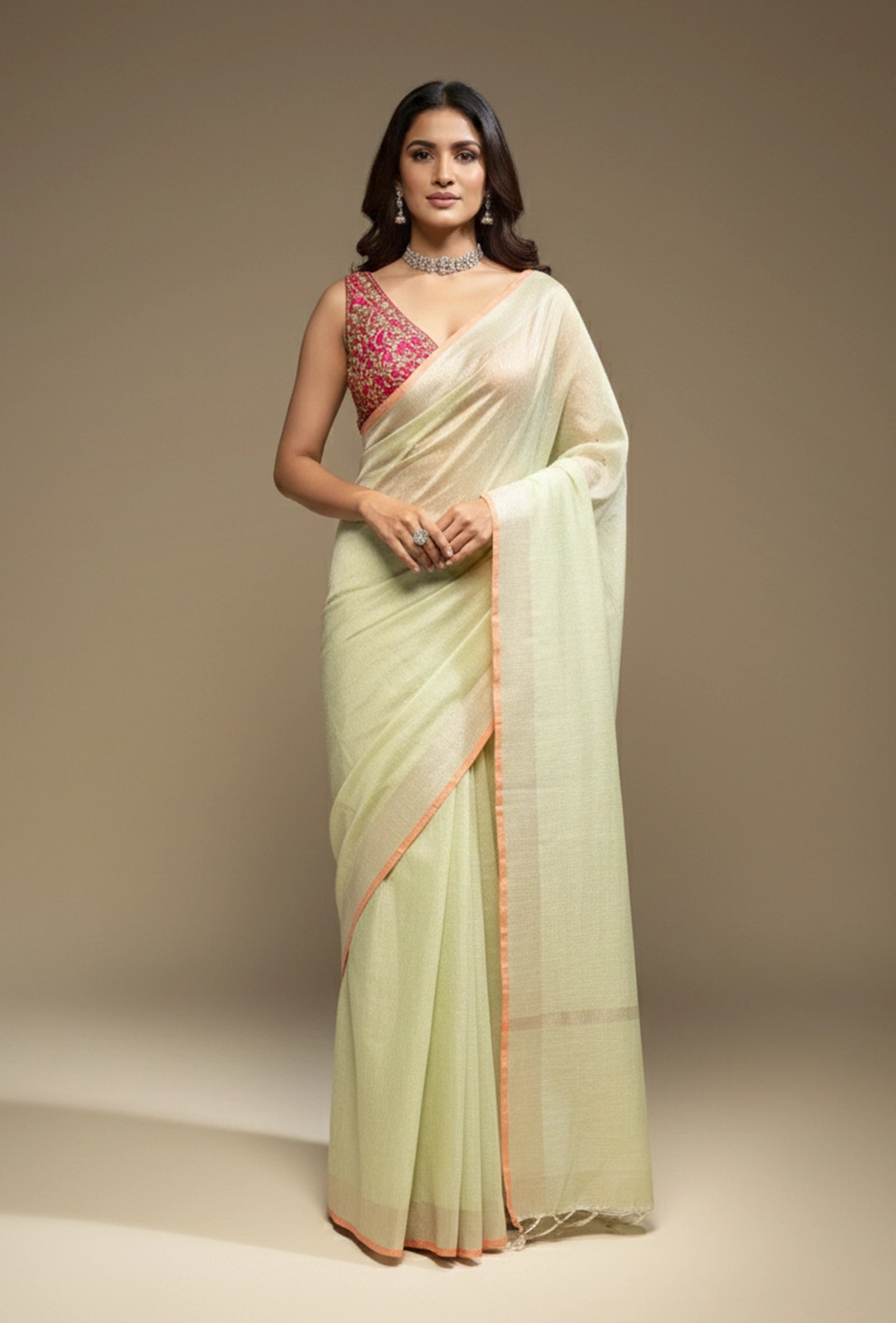 Emphasize the subtle color and delicate texture of this saree by pairing it with minimalist silver, pearl, or delicate diamond jewelry. Subtle stud earrings or a slender chain would beautifully complement the saree's understated beauty. Opt for comfortable block heels or elegant flats and a light-toned or woven clutch to complete your refined and serene look. This Khadi tissue saree is an impeccable choice for daytime events, intimate gatherings, formal brunches, or any occasion where you wish to combine traditional craftsmanship with a modern, minimalist aesthetic.