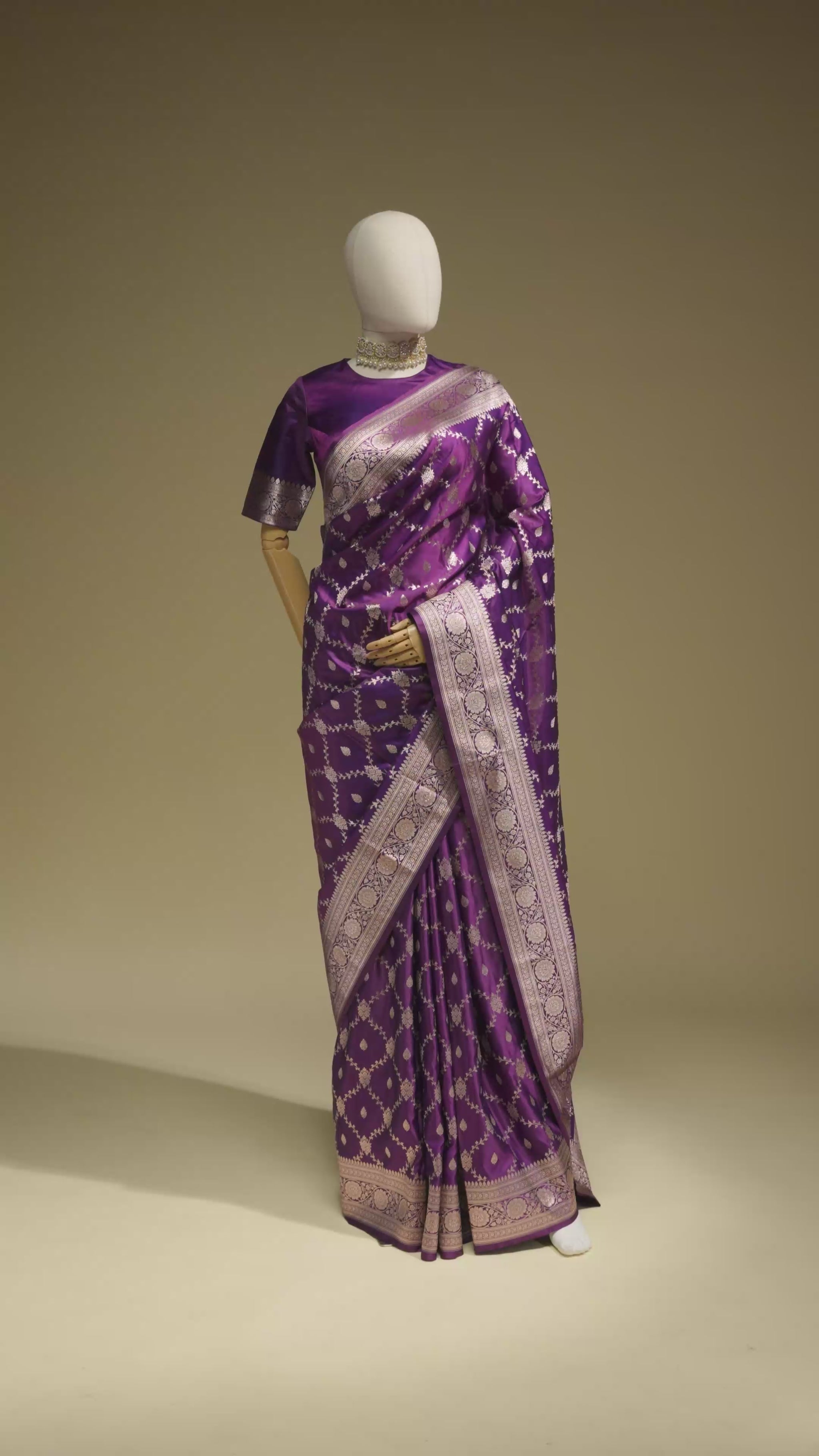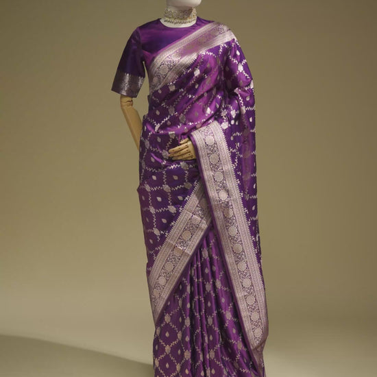 Step into unparalleled elegance with the Pure Mashru Silk Saree In Deep Purple With Intricate Jaal Work. Order now and embrace your imperial style.