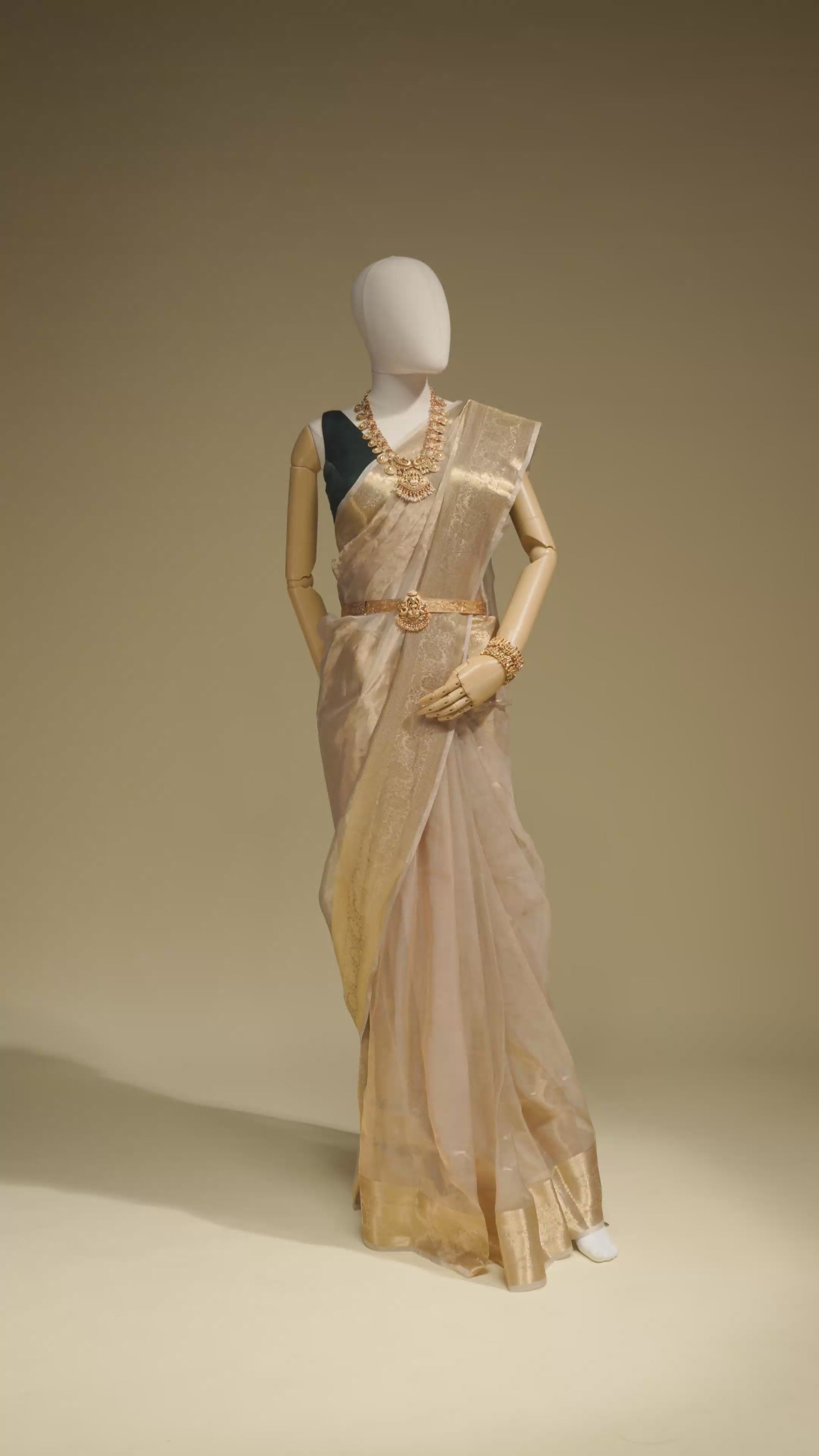 Dry Clean Only to preserve the delicate shimmer, the luxurious tissue fabric, and the radiant golden color of the saree. Handle with extreme care.