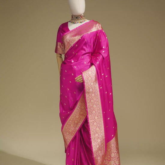 Step into unparalleled grace with the Pure Silk Saree In Pink With Zari Buttiwork. Order now and embrace your elegantly classic style.