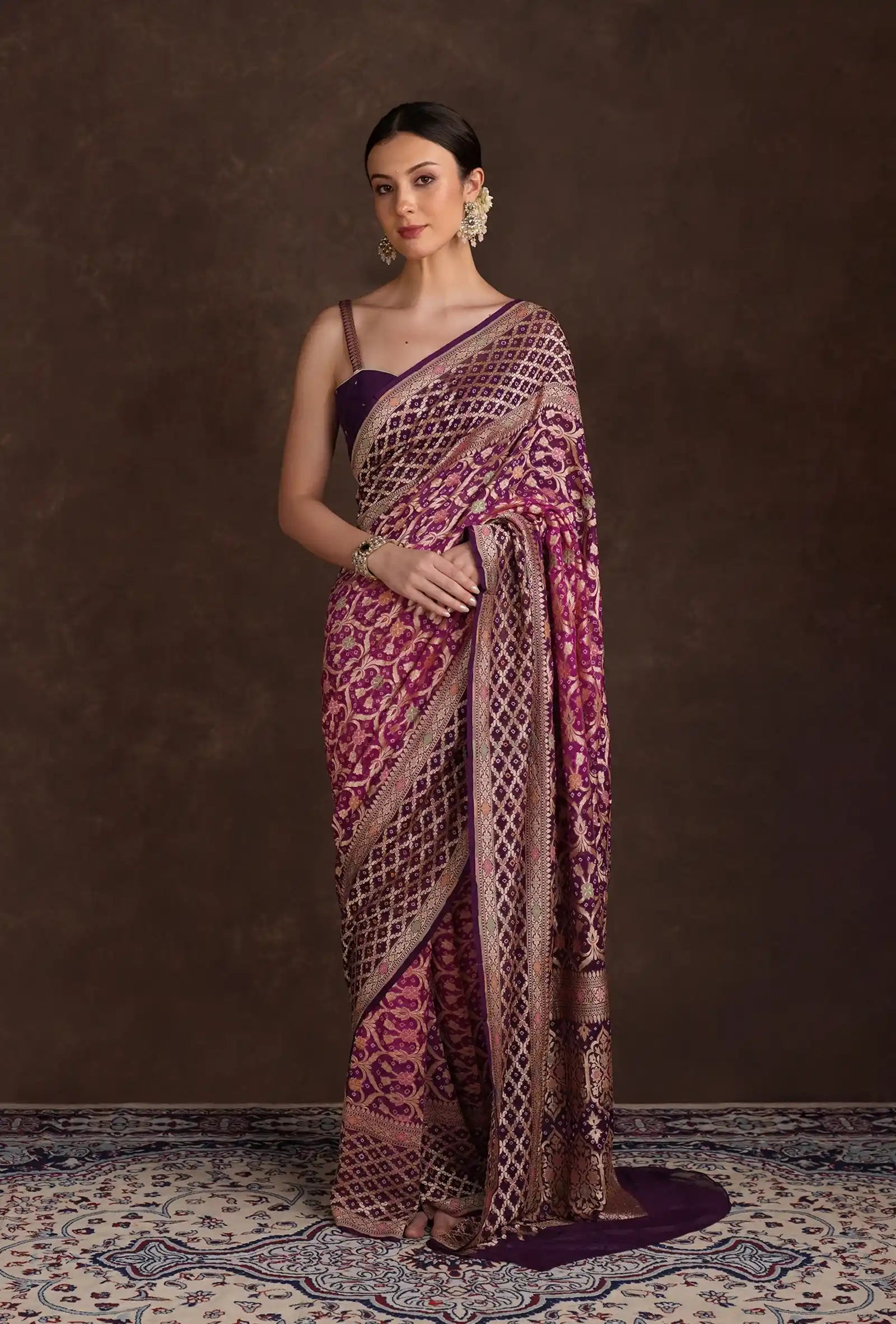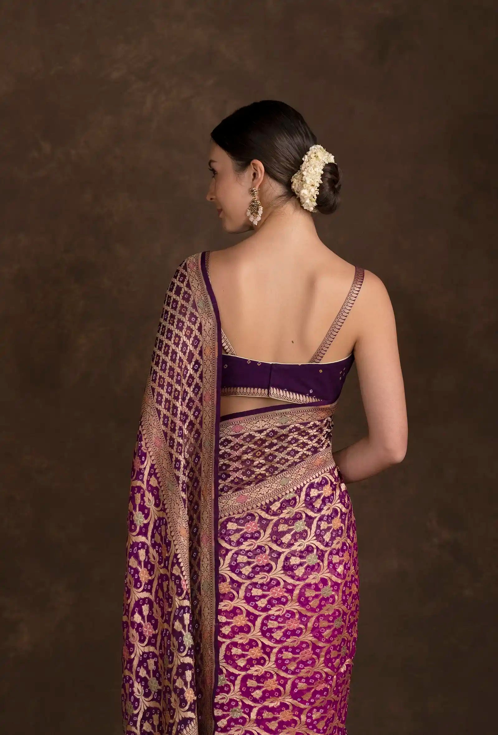 Step into unparalleled grace with the Purple Bandhani Tilfi Khadi Georgette Saree. Order now and embrace your resplendent style.