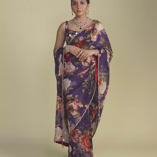 The rich purple hue provides a luxurious backdrop for the exquisite floral print, which is artfully scattered across the fabric. The delicate floral motifs add a touch of natural beauty and femininity, making this saree a perfect blend of classic and contemporary aesthetics.