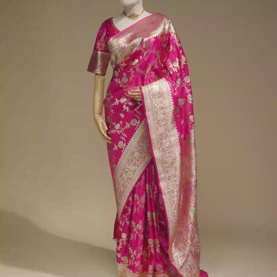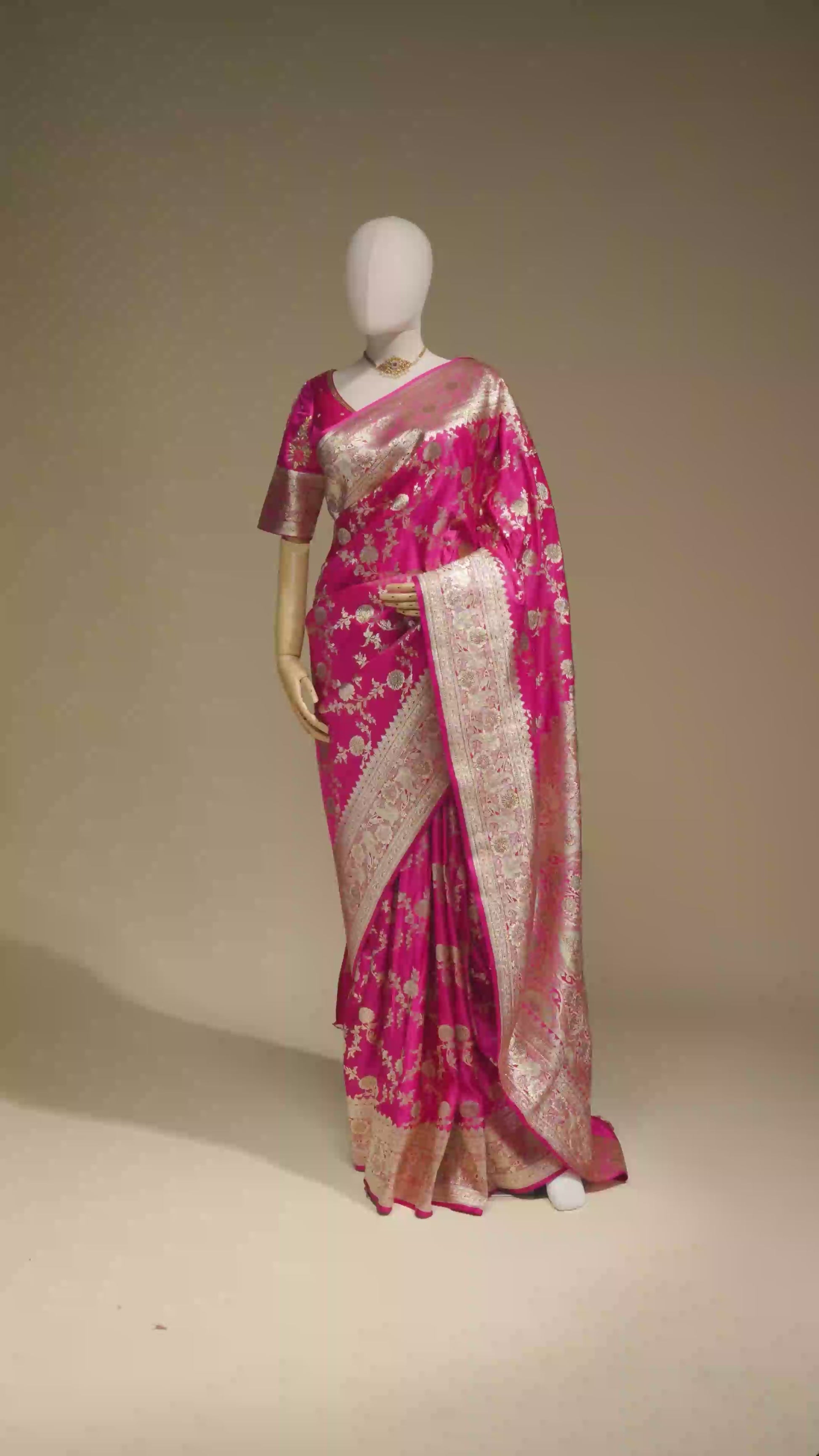 Enhance the radiant rani pink hue and the shimmering Zari work by pairing this saree with traditional gold, kundan, or antique gold jewelry. A classic choker necklace, elegant jhumkas, or delicate gold bangles would beautifully complement its traditional charm. Opt for gold or metallic heels and a matching embroidered clutch or potli bag to complete your sophisticated and graceful look. This saree is an impeccable choice for festive celebrations, weddings, traditional gatherings, cultural events, or any special occasion where you wish to blend classic elegance with a vibrant, luxurious touch.