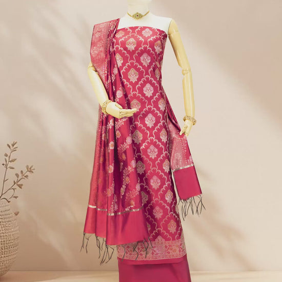 Our Red Banarasi Silk 3-Piece Suit Set is a classic piece for your wardrobe, ideal for brides and brides to be to radiate the feminie red energy and aura. Perfect for weddings, karwachauth or traditional events, this unstitched fabric allows you to create a custom fit kurta set from multiple design options
