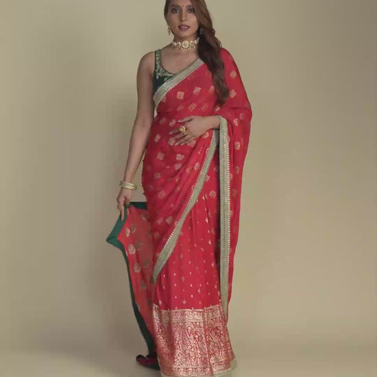 Reet Red Chinnon Buti Work Silk Saree with Emerald Green Blouse