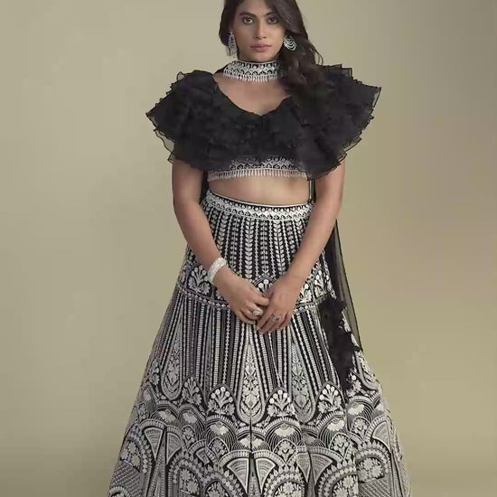 Regalia Black Ruffled Blouse with Chikankari Handwork Lehenga & Choker Dupatta