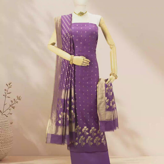Elevate your wardrobe with this elegant and royal Purple Chanderi Suit Set, crafted from a luxurious blend of lightweight silk and cotton. Known for its soft texture and subtle sheen, this suit offers a sophisticated look that’s perfect for festivals, family gatherings, or special occasions. The fine weaving and delicate fabric ensure you stay comfortable and stylish all day long, thanks to Chanderi's renowned breathability and lightness. Perfect for women who value comfort without compromising on style.