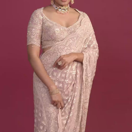 Saanjh Peachy Pink Lucknowi Pre Pleated Saree