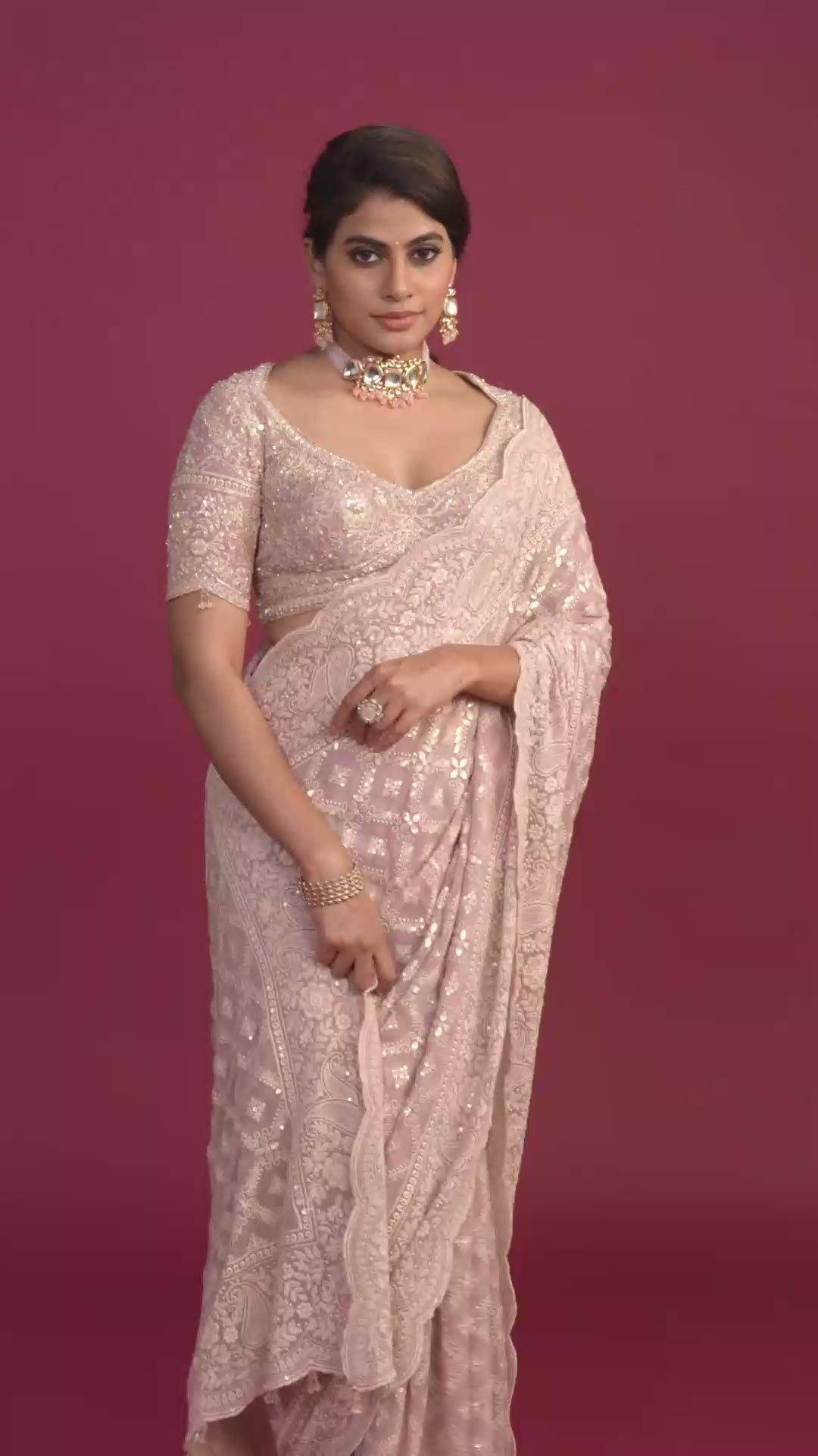 Let the subtle beauty of the peachy pink and intricate Lucknowi work shine. Pair this saree with traditional gold or pearl jewelry to complement its classic appeal – a simple pair of jhumkas or elegant studs would be perfect. For an elevated day look, consider a neat bun or soft waves, embracing the current trend of understated elegance. Complete your ensemble with comfortable embellished flats or juttis and a simple clutch. This pre-pleated saree is ideal for daytime events, family gatherings, festive occasions like Raksha Bandhan or Ganesh Chaturthi, or any semi-formal event where you desire a blend of traditional charm and modern comfort.