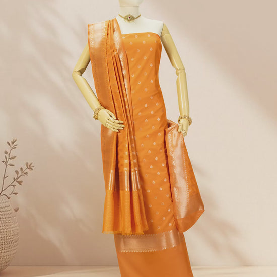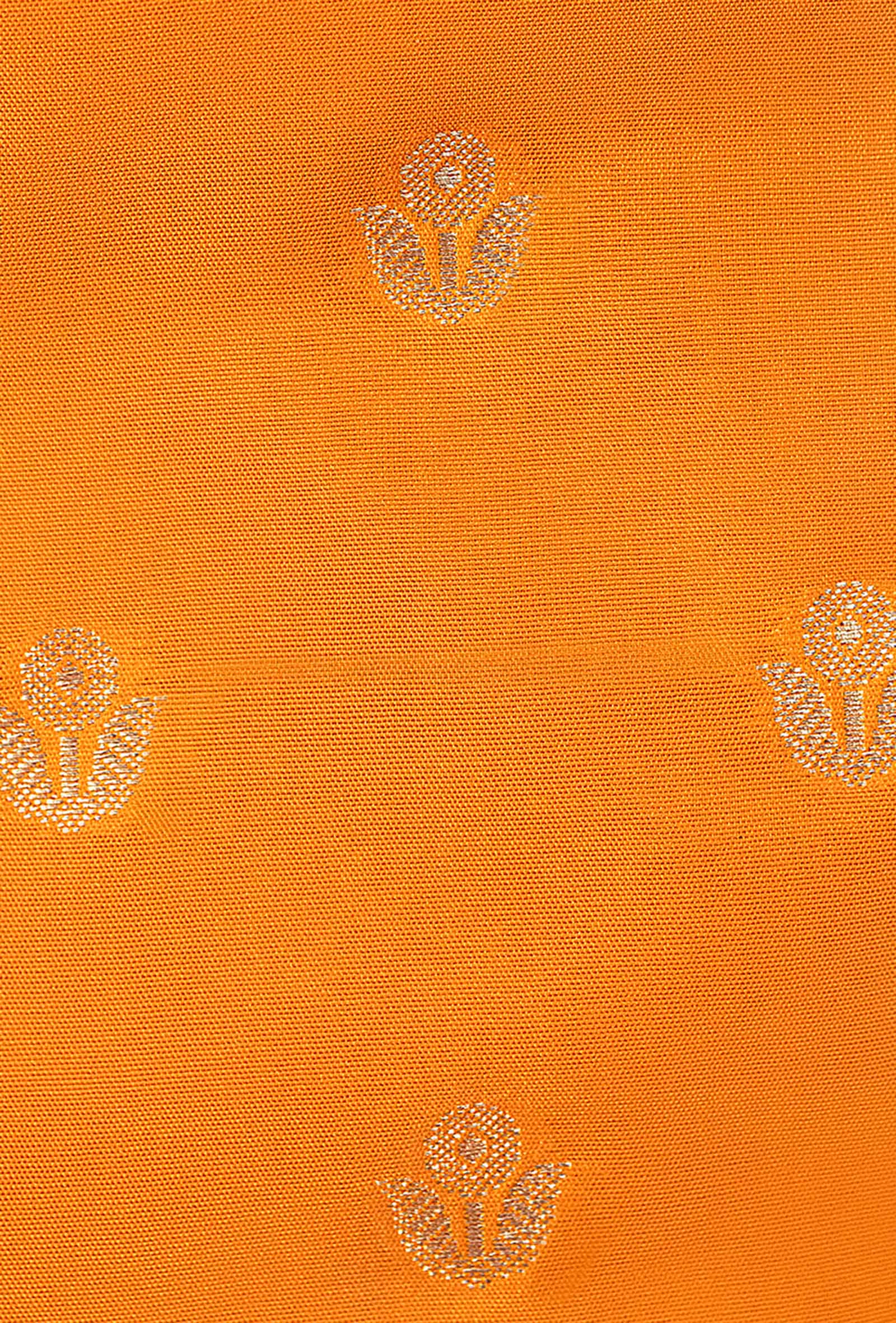 Its time you elevate your ethnic wardrobe with this Saffron Yellow Banarasi Silk 3-piece suit, It has a beautifully crafted kurta, pure silk pants, and complementary dupatta for your traditional celebrations.