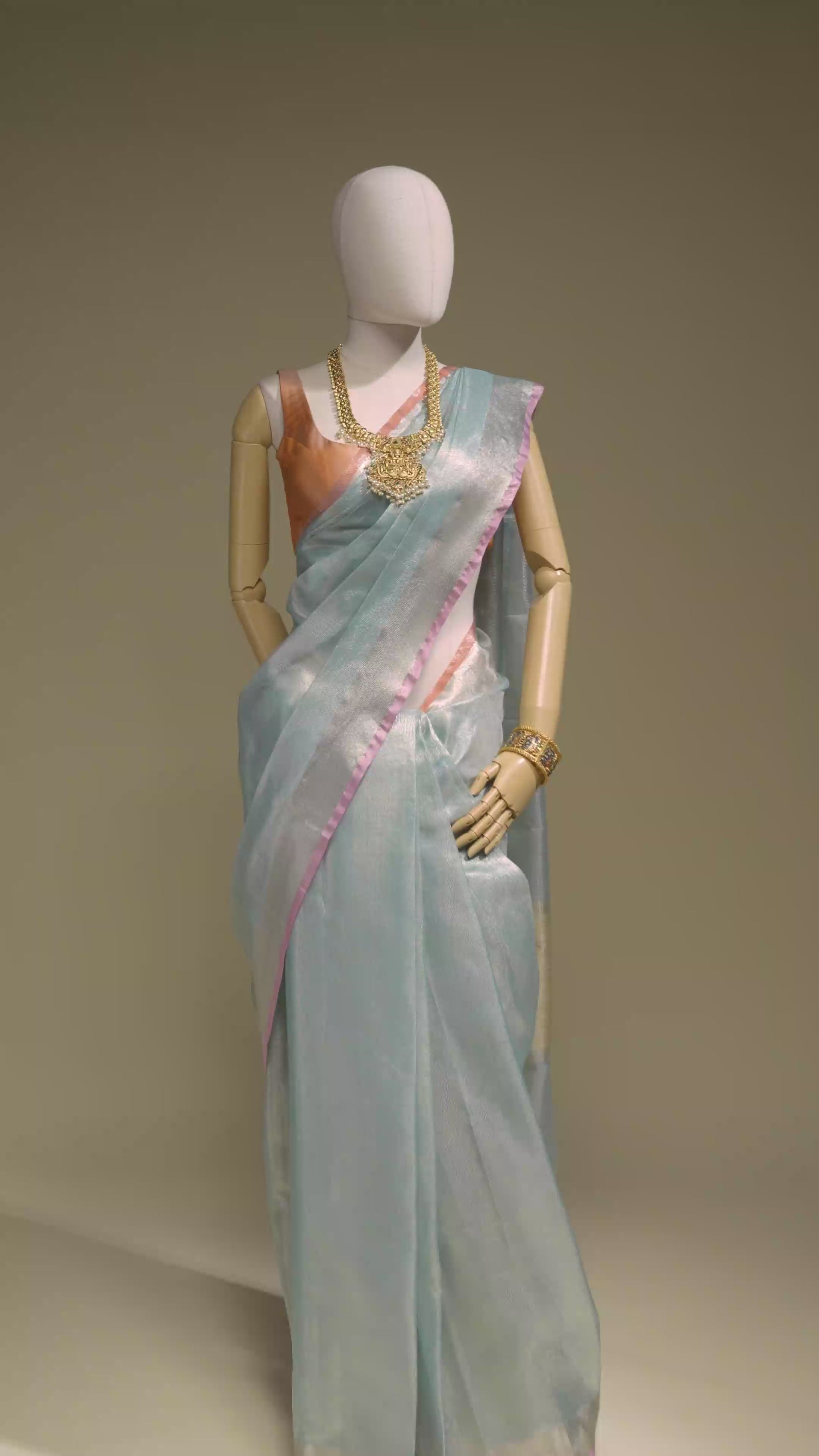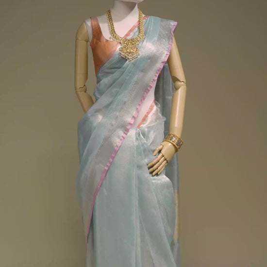 Sky Blue Khadi Tissue Saree With Unstitched Blouse