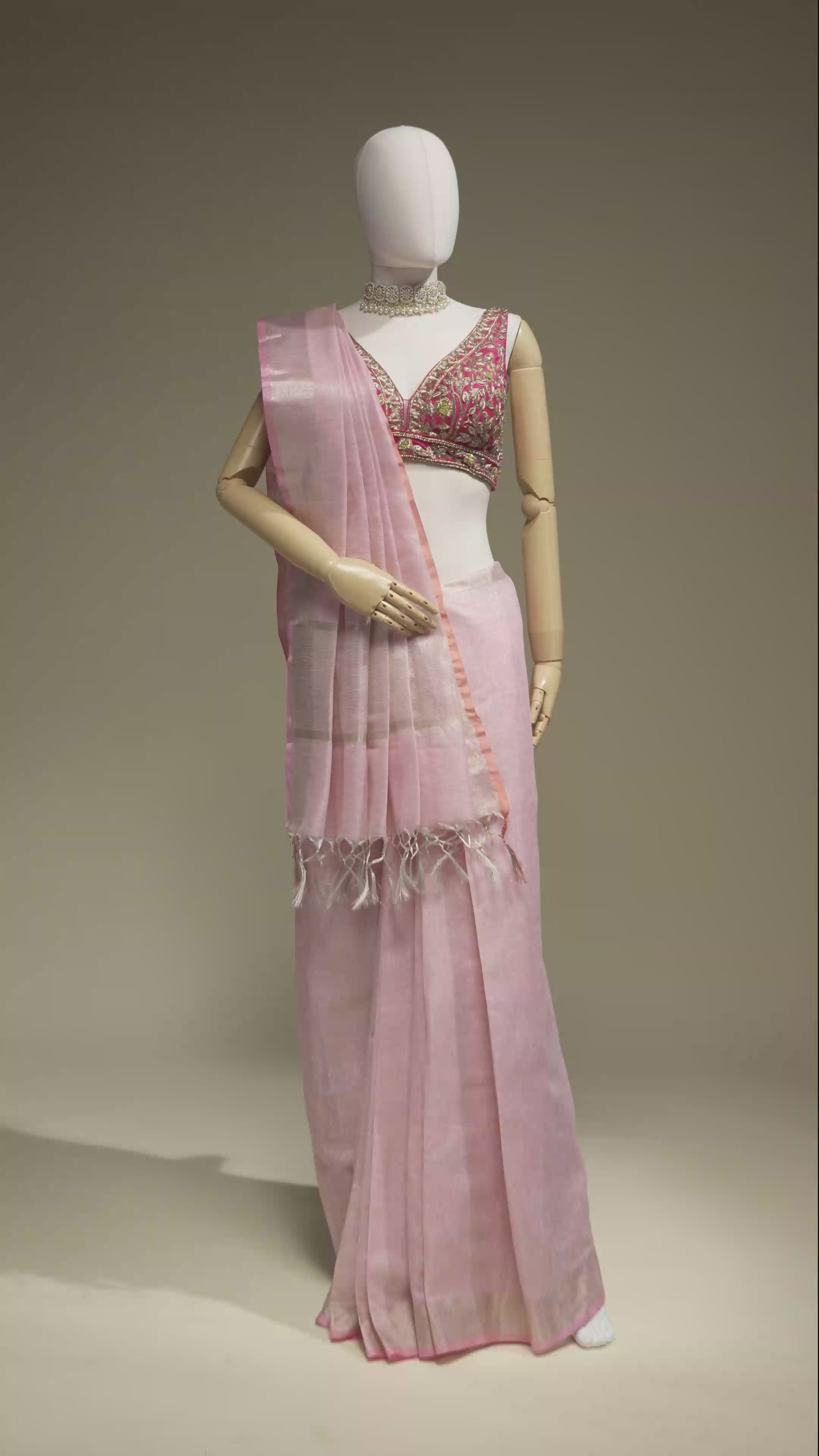 Dry Clean Only to preserve the delicate Khadi tissue fabric and the beautiful soft pink color of the saree.