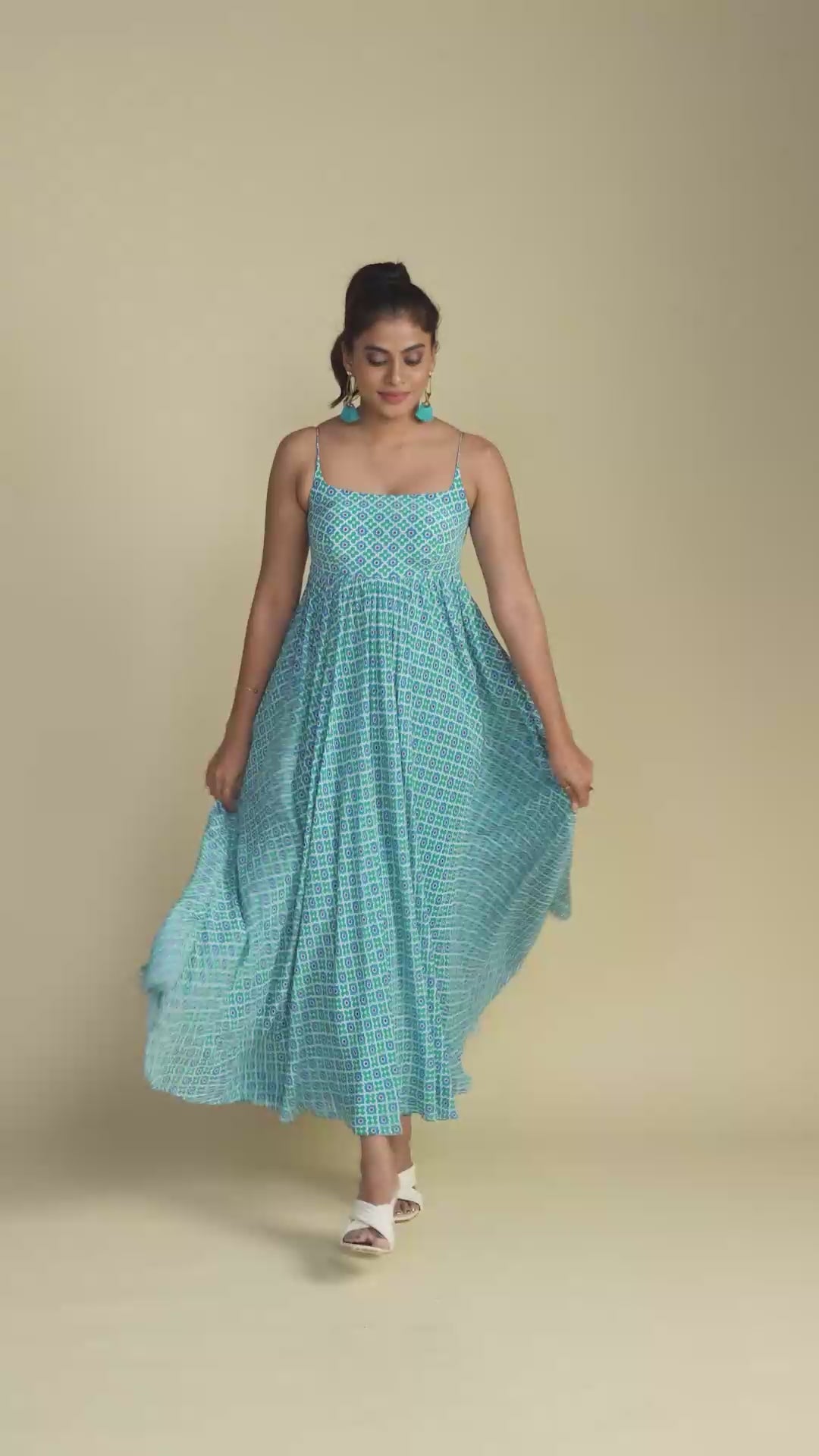 Crafted with delicate spaghetti sleeves, this maxi dress features a striking geometric print that adds a dynamic and artistic edge to its design. The bold lines and shapes create a visually interesting texture, setting it apart from traditional patterns. The flowing maxi length offers an effortlessly elegant drape, ideal for warm weather and relaxed occasions.