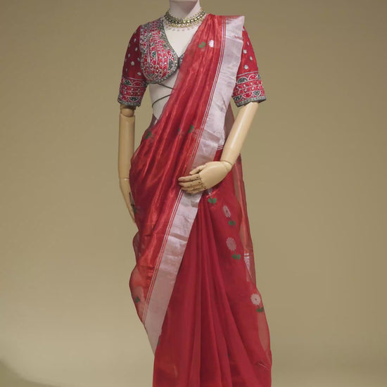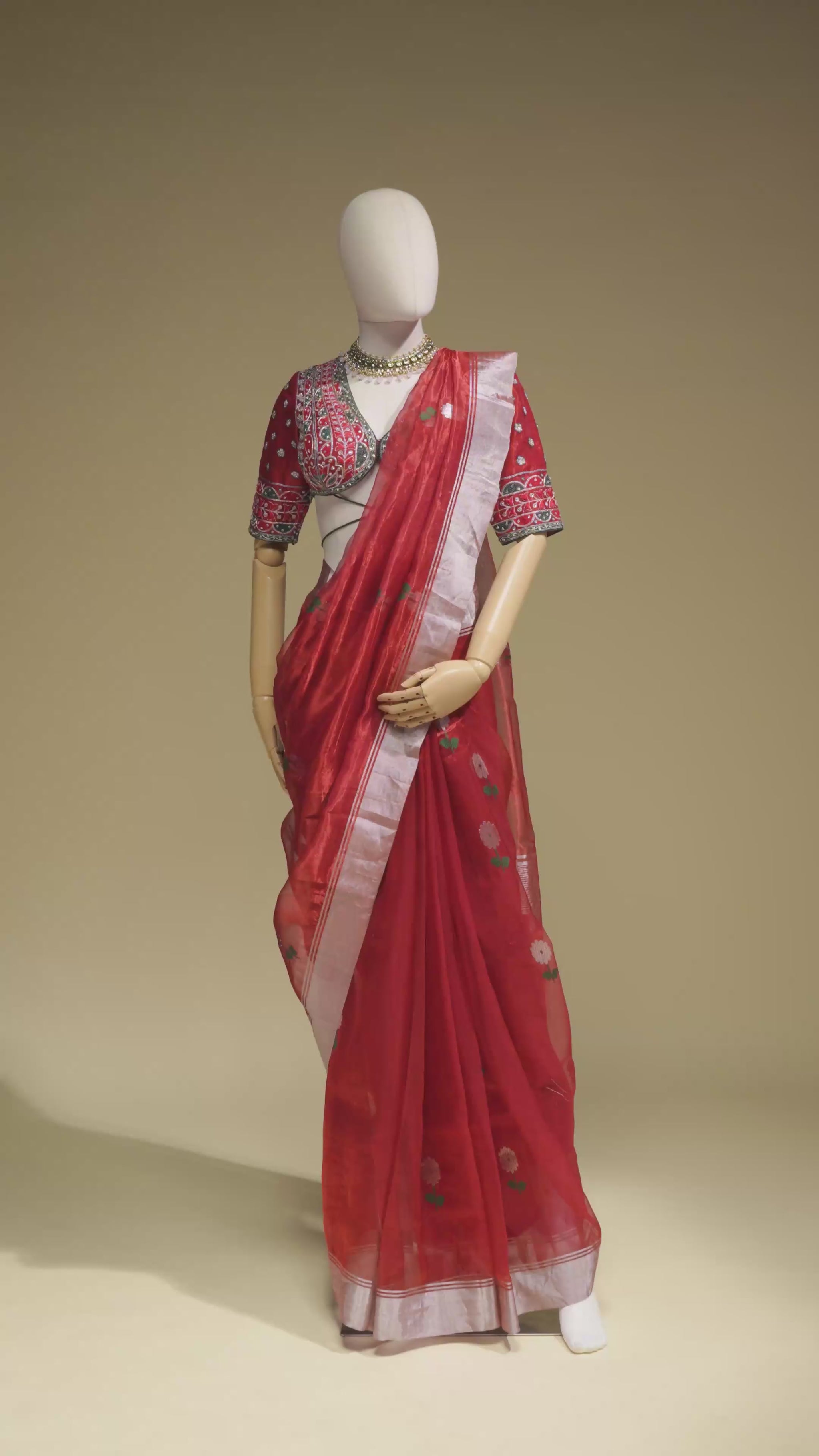 Drape yourself in classic allure with the Red Chanderi Tissue Silk Saree. This exquisite saree, in a vibrant and captivating shade of red, is a true embodiment of traditional Indian artistry and refined elegance. Crafted from luxurious Chanderi Tissue Silk, it offers a lightweight, ethereal feel with a subtle, shimmering transparency that is both delicate and sophisticated. The saree is adorned with intricate Pure Zari Buttiwork, featuring delicate golden motifs meticulously woven across the fabric, adding a touch of timeless opulence and sparkle. This set includes an unstitched blouse piece, allowing for personalized tailoring to perfectly complement your unique style and fit.