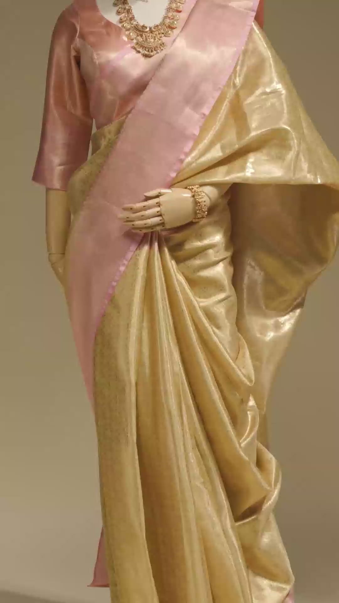 Adorned with intricate paisley motifs, this saree showcases a rich golden hue that blends harmoniously with delicate pink accents, creating a captivating visual symphony. It's the perfect choice for weddings, grand festivities, or any occasion where you want to make a lasting impression.